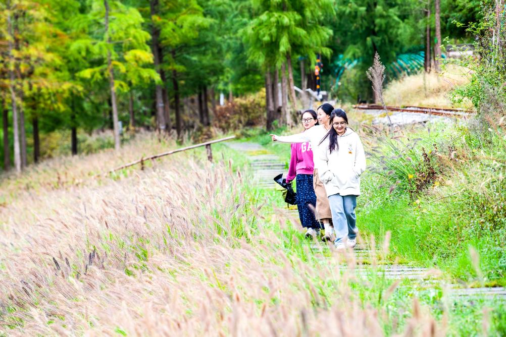 10月15日,游客在湿地公园湖畔步道上游玩。