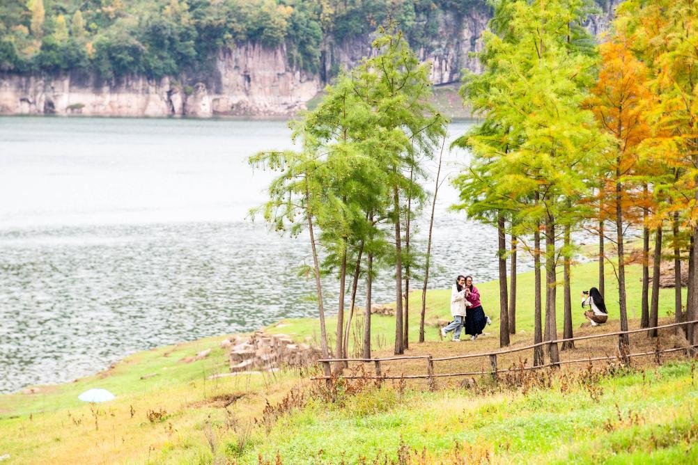 10月15日,游客在湿地公园湖畔拍照打卡留影。